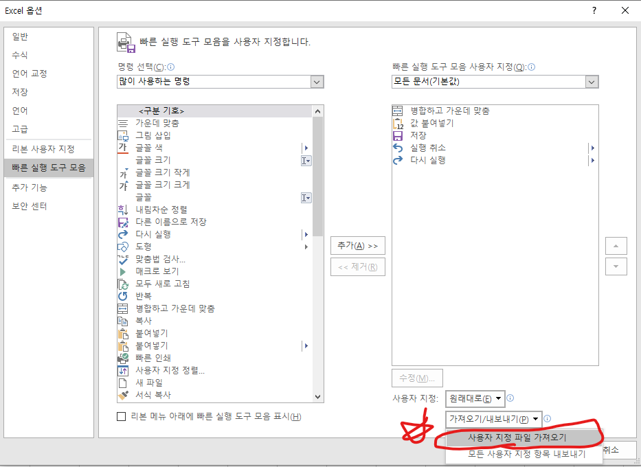 '리본 사용자 지정' 과 '빠른 실행 도구 모음' 모두 상기 절차로 복사하시면 됩니다.