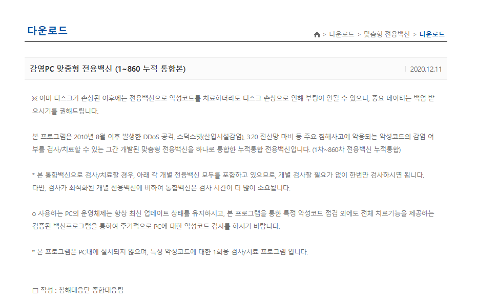 한국인터넷 진흥원에서 만든 백신이니, 가장 위험한 백신들을 잡을 수 있을 거라고 생각합니다.