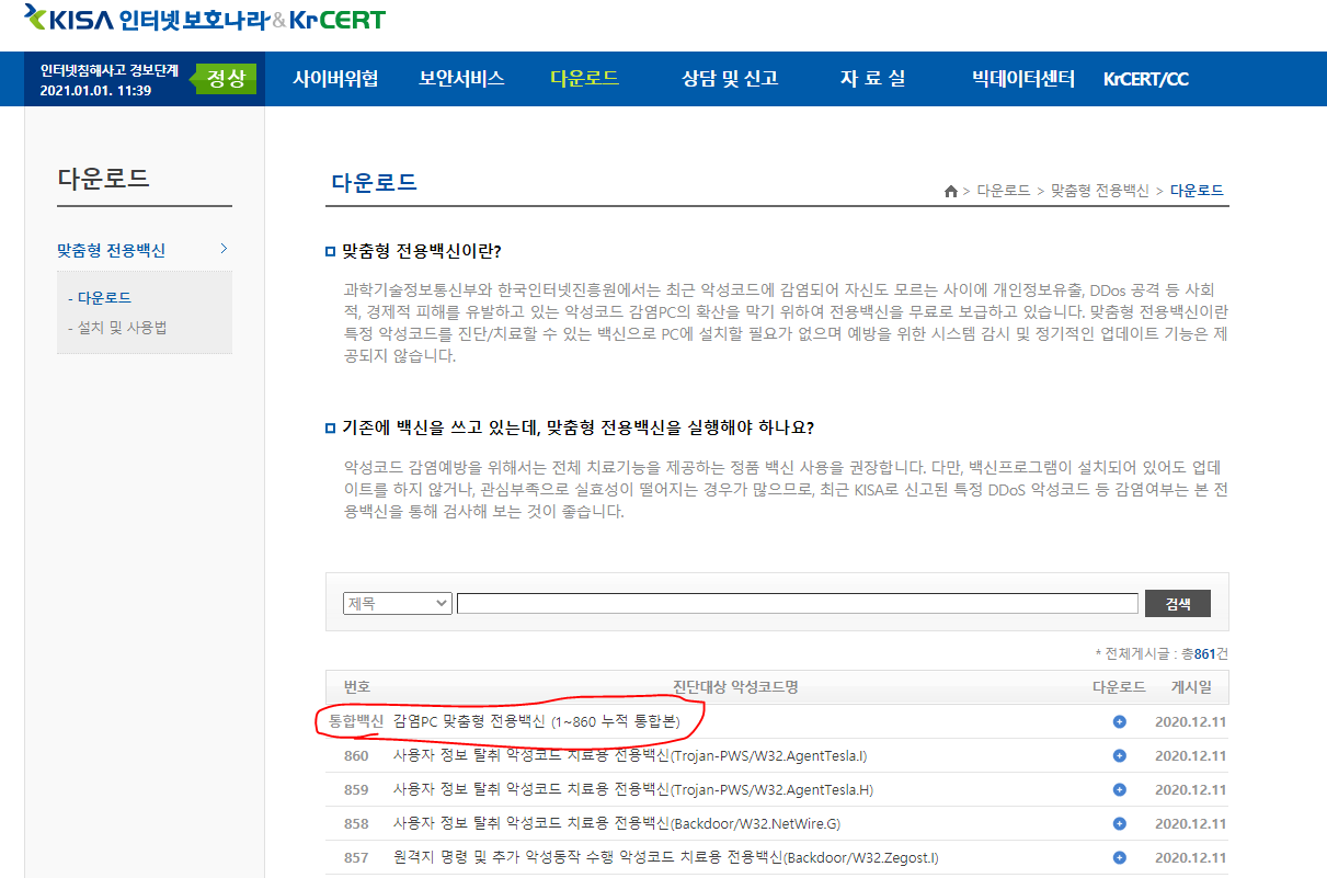홈페이지 접속 후에, 통합 백신을 누르고 실행시키시면 끝입니다.