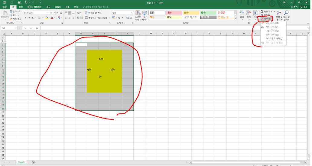 셀 지우기가 상당히 쉬운 위치에 있더라고요.
