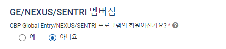 - GE/NEXUS/SENTRI 멤버십은 아니요로 넘어갑니다.