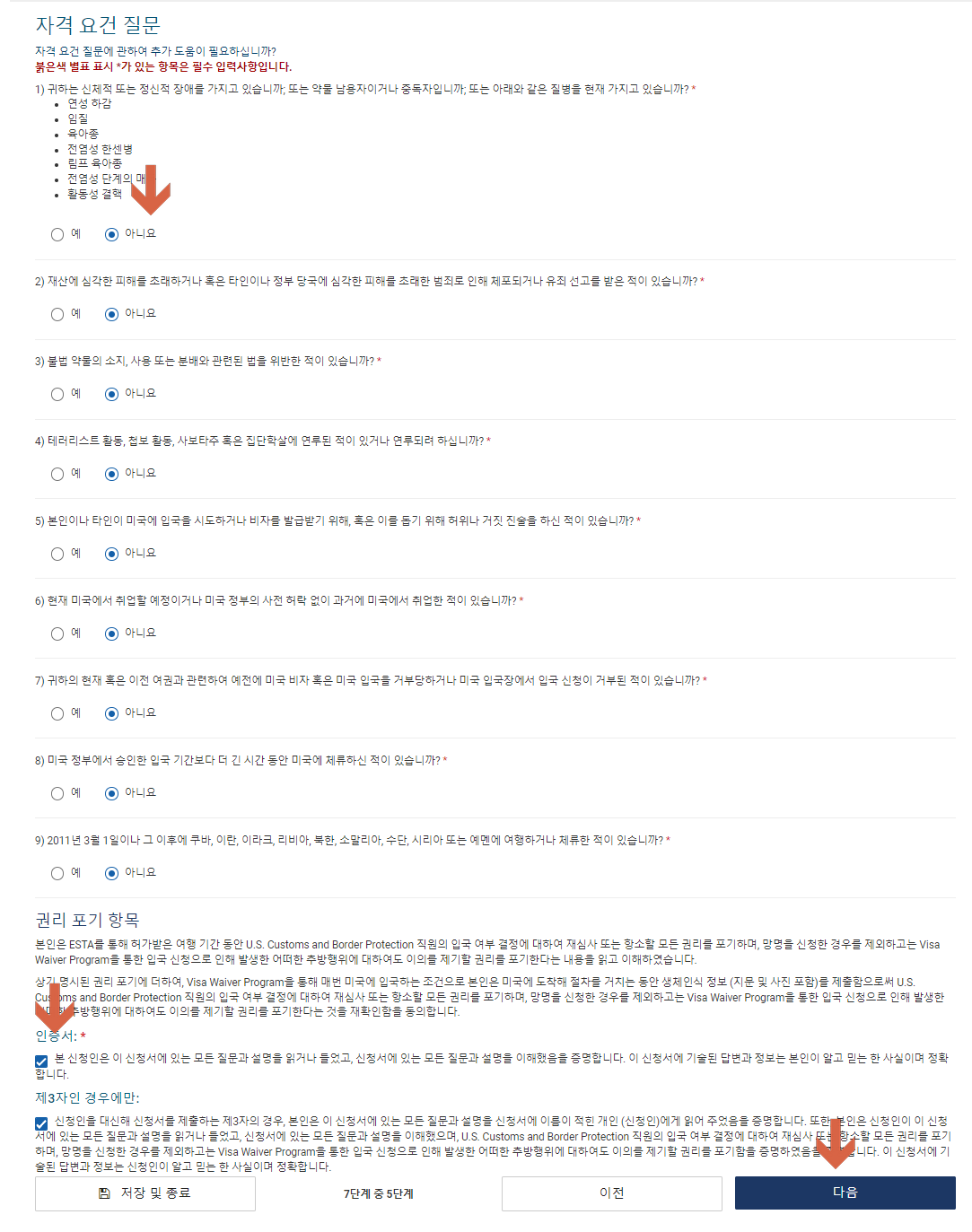 - 자격요건 질문 : 아니요 클릭 후 동의 하고 다음으로 넘어가기