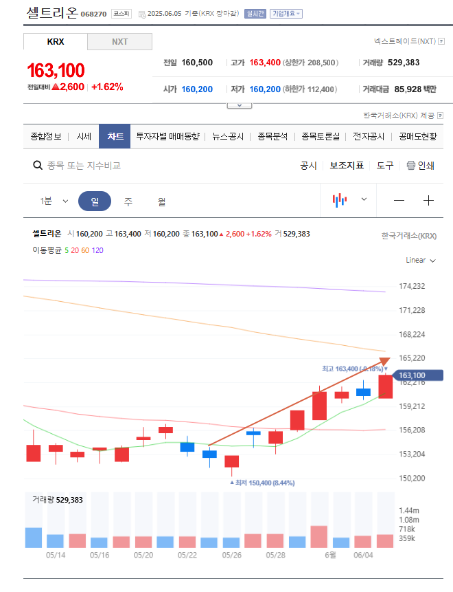 2주동안 최고점은 163400 원 으로 7% 상승이네요.