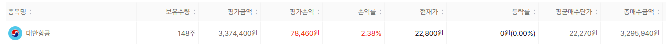 제 계좌를 까자면.. (공부와 기록의 목적입니다.) 대한항공이 수익중입니다. (3월에 사서 꽤나 ? 저 나름대로 버텼습니다.)
