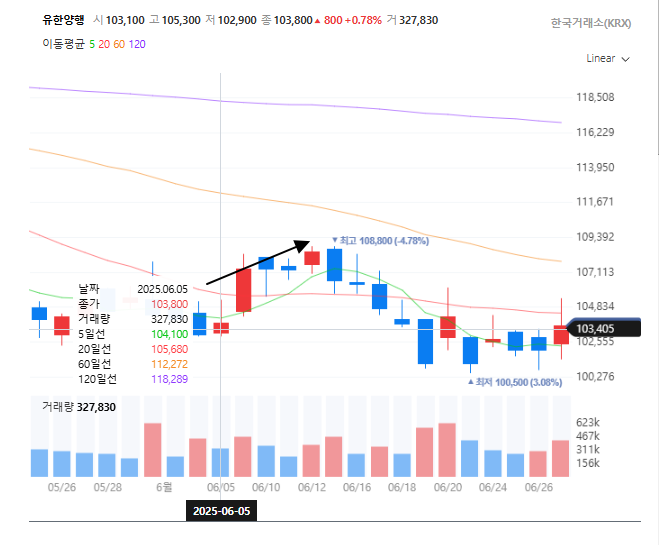 - 유한양행도 4% 상승정도 했으니, (108800원) 그 아래에서 욕심 안부렸다면 수익 봤겠네요.