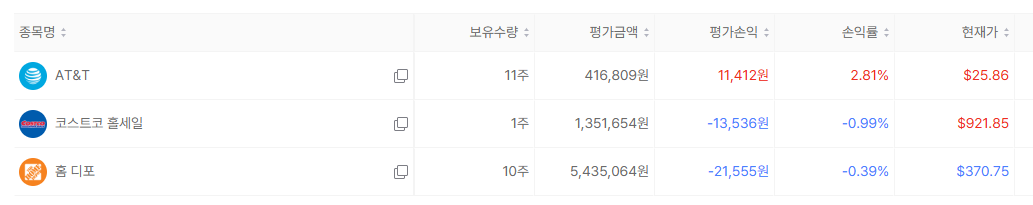 미장에서 3개 주식(AT&T, 코스트코, 홈 디포)는 단기적으로 목표를 2.5 % 잡았는데, 원하는 만큼 올라왔던 것 같은데, 팔지 않고 있다가 계속 하락했고, 1달이 거의 다됬는데 이제야 복구가 되는 것 같습니다.