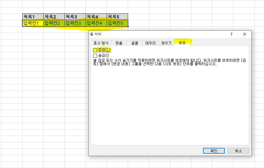 2. 모든 셀들은 기본으로 셀서식이 '잠금'설정 되어 있습니다. 입력을 허용할 셀을 선택 후 '잠금'해제 해주셔야 합니다.