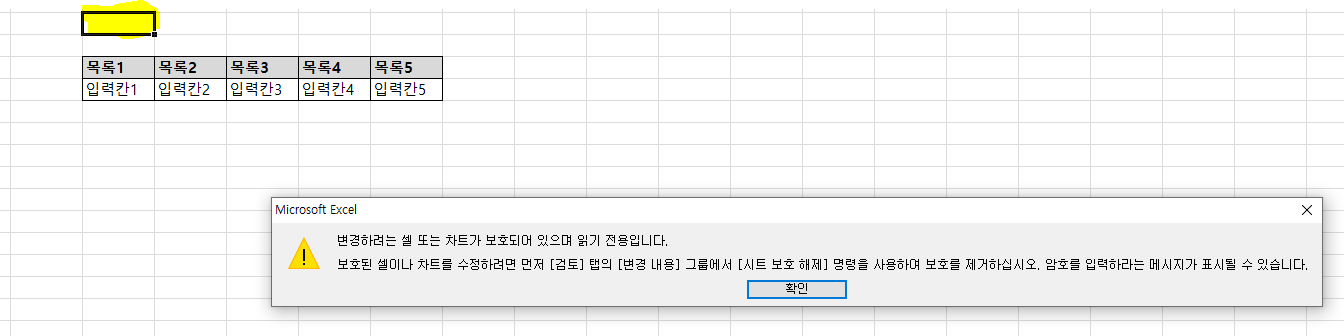 1. 예제로 아래 노란 부분만 입력할 수 있고 나머지는 변경할 수 없게 설정하도록 해보겠습니다.