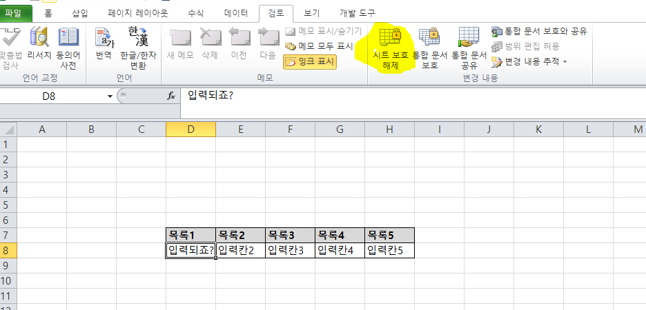 6. 다시 시트 보호 해제를 하려면 아래와 같이 따라하세요.